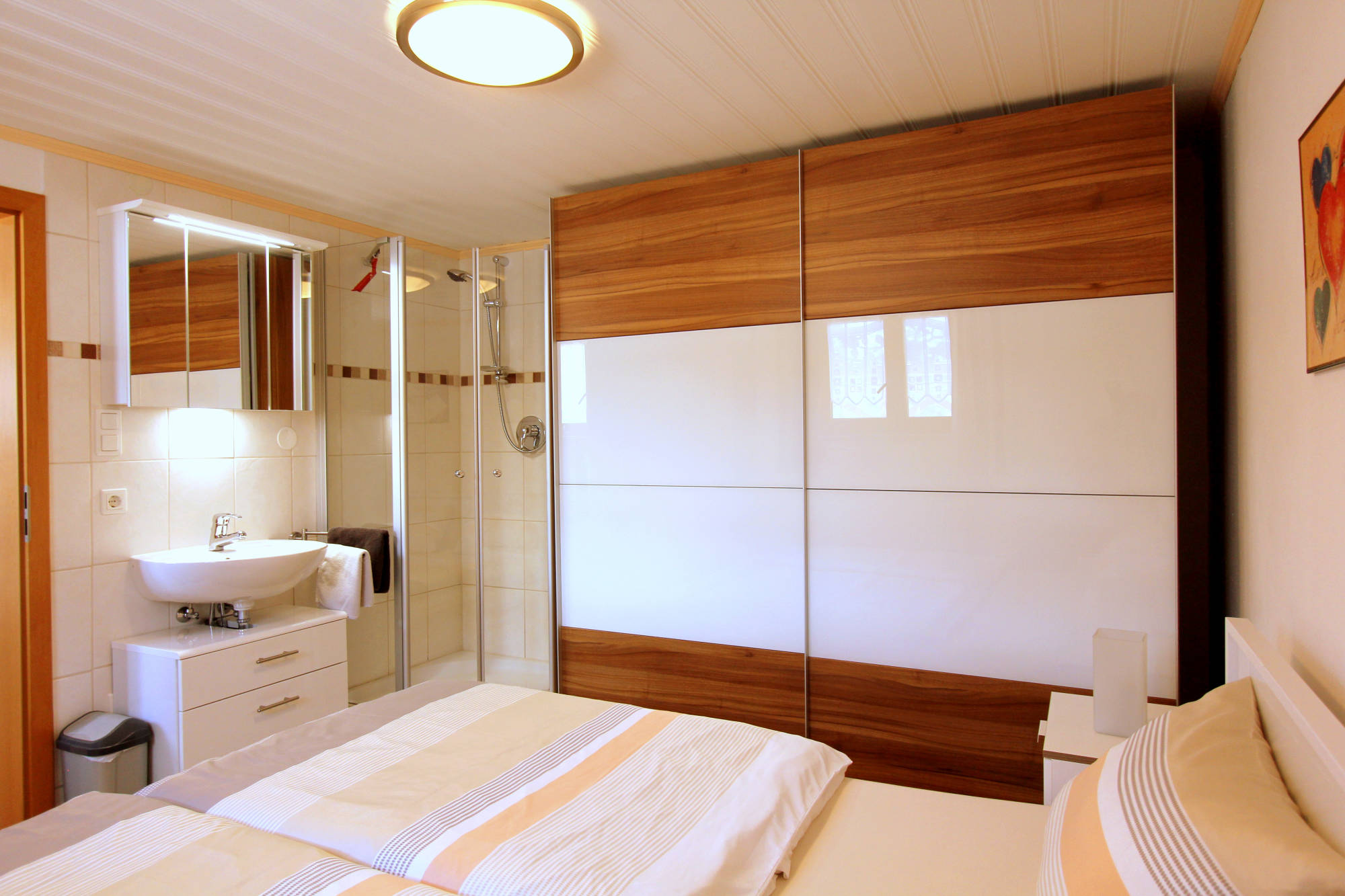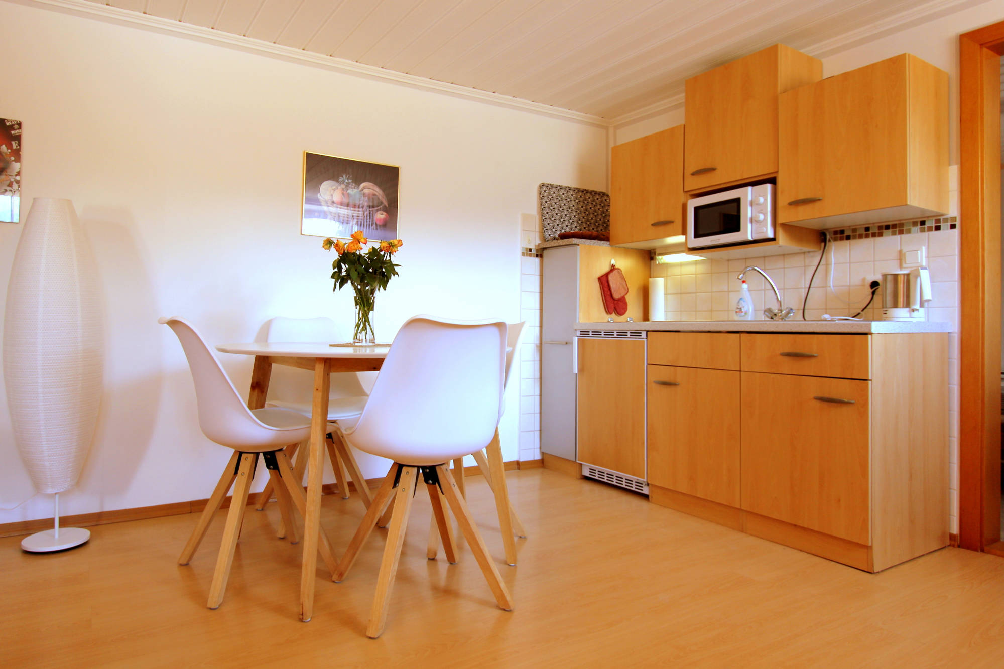 Zur Ausstattung gehören Garderobe, Kühlschrank, Wasserkocher, Kaffeemaschine, Toaster und Eierkocher, Frühstücksgeschirr, Gläser.