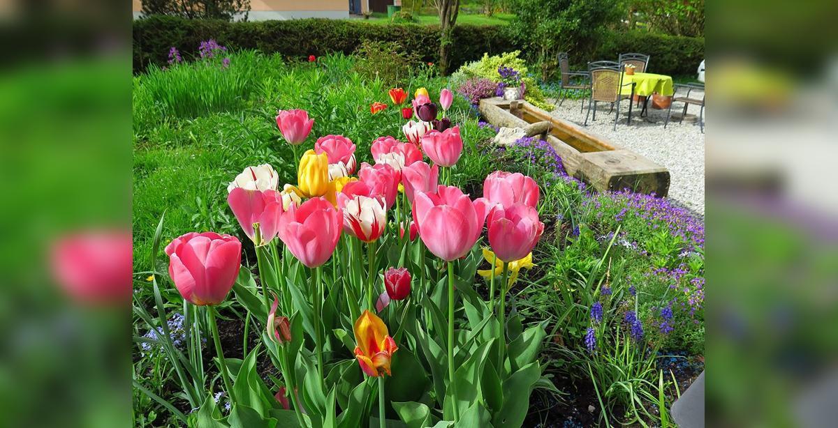 Im Garten des Hauses befindet sich eine Gäste-Sitzgruppe am plätschernden Weiher und lädt Sie zum Entspannen ein.